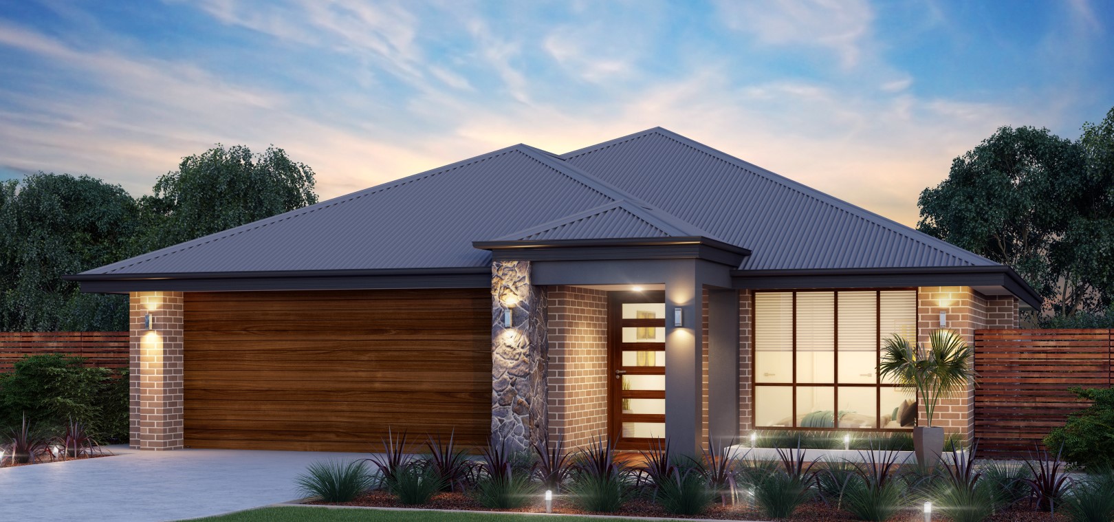 The Moderne series of façades offers a choice of stunning designer options that combine style, substance and exceptional cost-effectiveness through conventional ‘hip and valley’ construction. Use of modern, geometric shapes draws the eye towards the home and gives the porch and entrance a warm, welcoming feel.